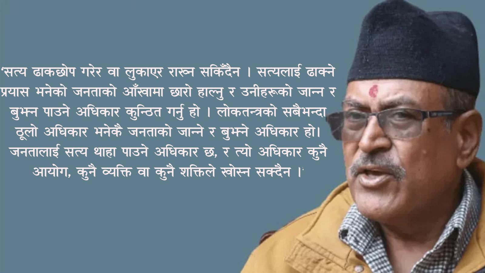 सत्यलाई ढाक्ने प्रयास भनेको जनताको आँखामा छारो हाल्नु र उनीहरुको जान्न र बुझ्न पाउने अधिकार कुन्ठित गर्नु हो । लोकतन्त्रको सबैभन्दा ठूलो अधिकार भनेकै जनताको जान्ने र बुझ्ने अधिकार हो। जनतालाई सत्य थाहा पाउने अधिकार छ, र त्यो अधिकार कुनै आयोग, कुनै व्यक्ति वा कुनै शक्तिले खोस्न सक्दैन ।’