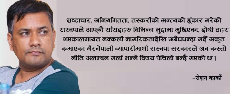 -रोशन कार्की भ्रष्टाचार, अनियमितता, तस्करीलगायत कार्यलाई समाप्त पार्ने र देश विधि र कानुन अनुसार चलाउने नारा दिई निर्वाचनमा गएको राष्ट्रिय स्वतन्त्र पार्टीले देशमा एकल सरकार गठन गर्ने अन्तिम चरणमा पुगेको छ । एकातर्फ आकर्षक नारा दिएको छ भने अर्कोतर्फ सोही दलमा विभिन्न दलबाट अबसर लिएर विभिन्न मुद्दा मामिलामा परेका व्यक्तीहरु अहिले साँसद बनेर आएका छन् … Continue reading मालपानीको नक्कली दुई नागरिकता र बालेन्द्र साहको सरकार !!!