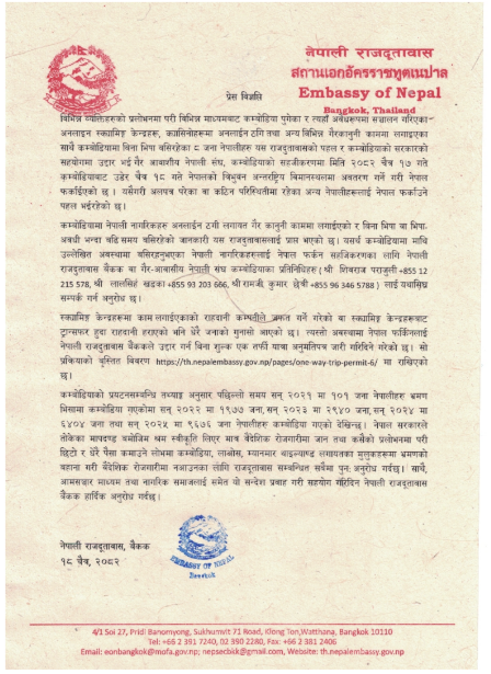 काठमाडौँ । कम्बोडियामा अनलाइन ठगी र अन्य गैरकानुनी गतिविधिमा संलग्न र बिना भिषा बसिरहेका ८ जना नेपाली नागरिकलाई उद्दार गरी नेपाल फर्काइएको छ। विभिन्न व्यक्तिहरूको प्रलोभनमा परी कम्बोडियाका अवैध अनलाइन स्क्यामिङ्ग केन्द्र, क्यासिनो तथा अन्य गैरकानुनी काममा संलग्न भएका यी नेपाली नागरिकलाई नेपाल फर्काउन नेपाली राजदूतावास बैंककको पहल र कम्बोडियाली सरकारको सहयोग प्राप्त भएको हो।