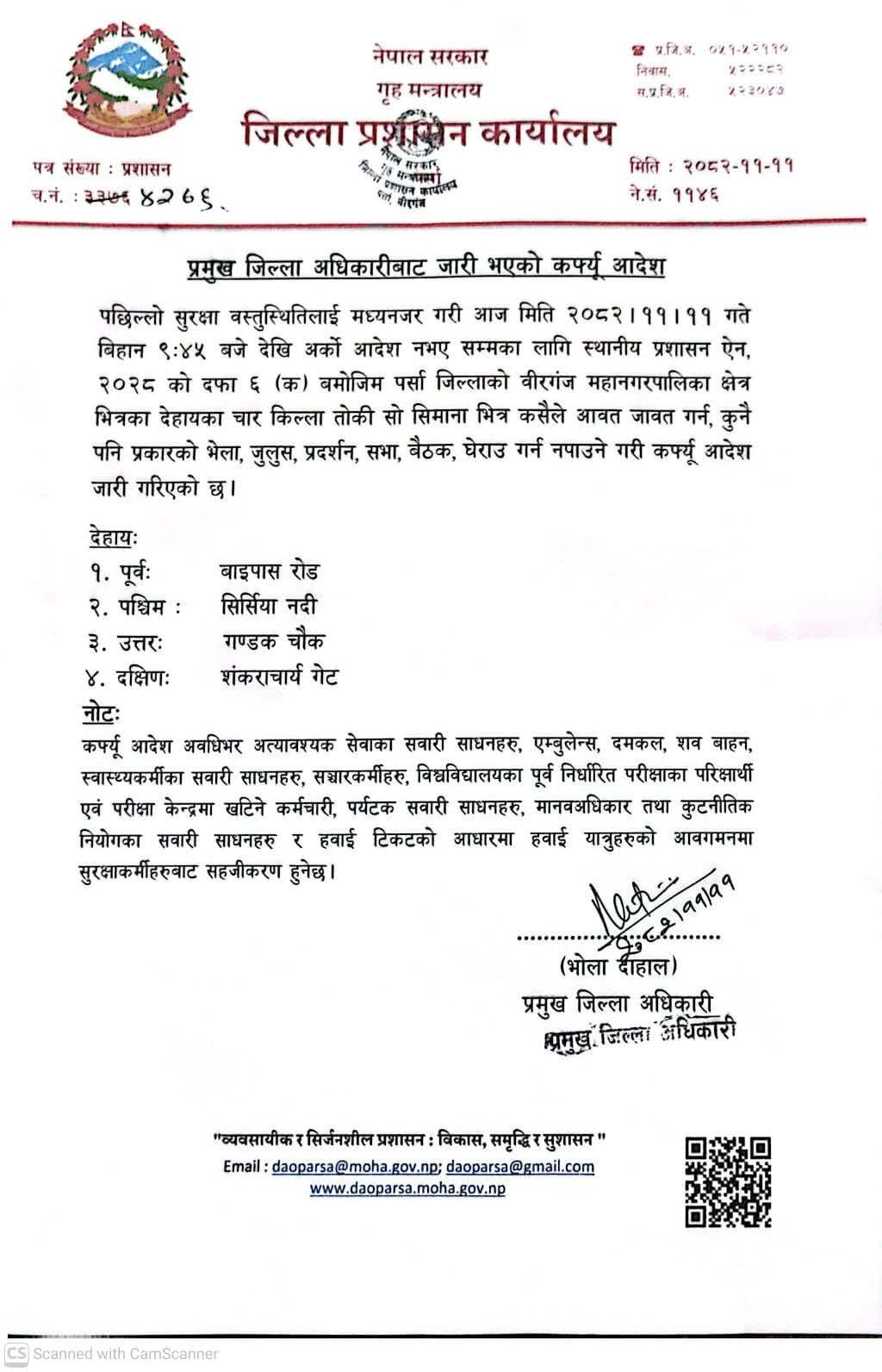 जनकपुरधाम । जिल्ला प्रशासन कार्यालय, पर्साले वीरगञ्ज महानगरपालिकामा कर्फ्यू आदेश जारी गरेको छ । प्रमुख जिल्ला अधिकारी भोलानाथ दाहालले — विस्तृतमा