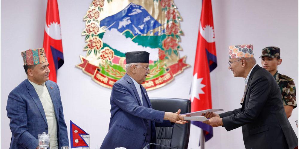 काठमाडौं, २९, साउन । प्रधानमन्त्री केपी शर्मा ओलीसँग चालु आर्थिक वर्षमा गरिने मुख्य काम र हासिल हुने उपलब्धिका लागि उपप्रधानमन्त्रीद्वय, मन्त्री र मुख्यसचिवहरूबिच विहिबार कार्यसम्पादन सम्झौता गरिएको छ । प्रधानमन्त्री तथा मन्त्रिपरिषद्को कार्यालय, सिंहदरबारमा मन्त्रालयगत वार्षिक प्रगति समीक्षाका साथै आगामी कार्यक्रमको कार्यसम्पादन सम्झौतामा हस्ताक्षर भई आदानप्रदान भएको प्रधानमन्त्रीको कार्यालयले जनाएको छ ।