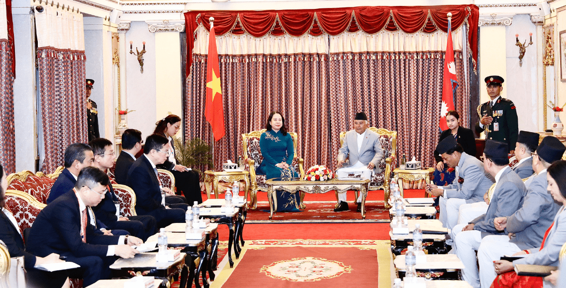 काठमाडौं । राष्ट्रपति रामचन्द्र पौडेल र नेपाल भ्रमणमा रहेहनु भएकी भियतनामका उपराष्ट्रपति भो थि आन सुआनबीच सोमबार शिष्टचा भेटवार्ता भएको छ। राष्ट्रपति कार्यालय शीतल निवासमा भएको सो भेटमा दुई देशबीच व्यापार, पर्यटन, लगानी र प्रविधि हस्तान्तरणका क्षेत्र लगायत द्विपक्षीय सम्बन्ध सुदृढ गर्ने सम्भावनाबारे छलफल भएको बताइएको छ । राष्ट्रपति पौडेलले नेपाल र भियतनामबीच आर्थिक सहकार्य विस्तारका लागि ठूलो सम्भावना रहेको बताउँदै यसलाई तीव्रता दिन समेत नेपाल सरकार इच्छुक रहेको बताउनु भएको छ ।