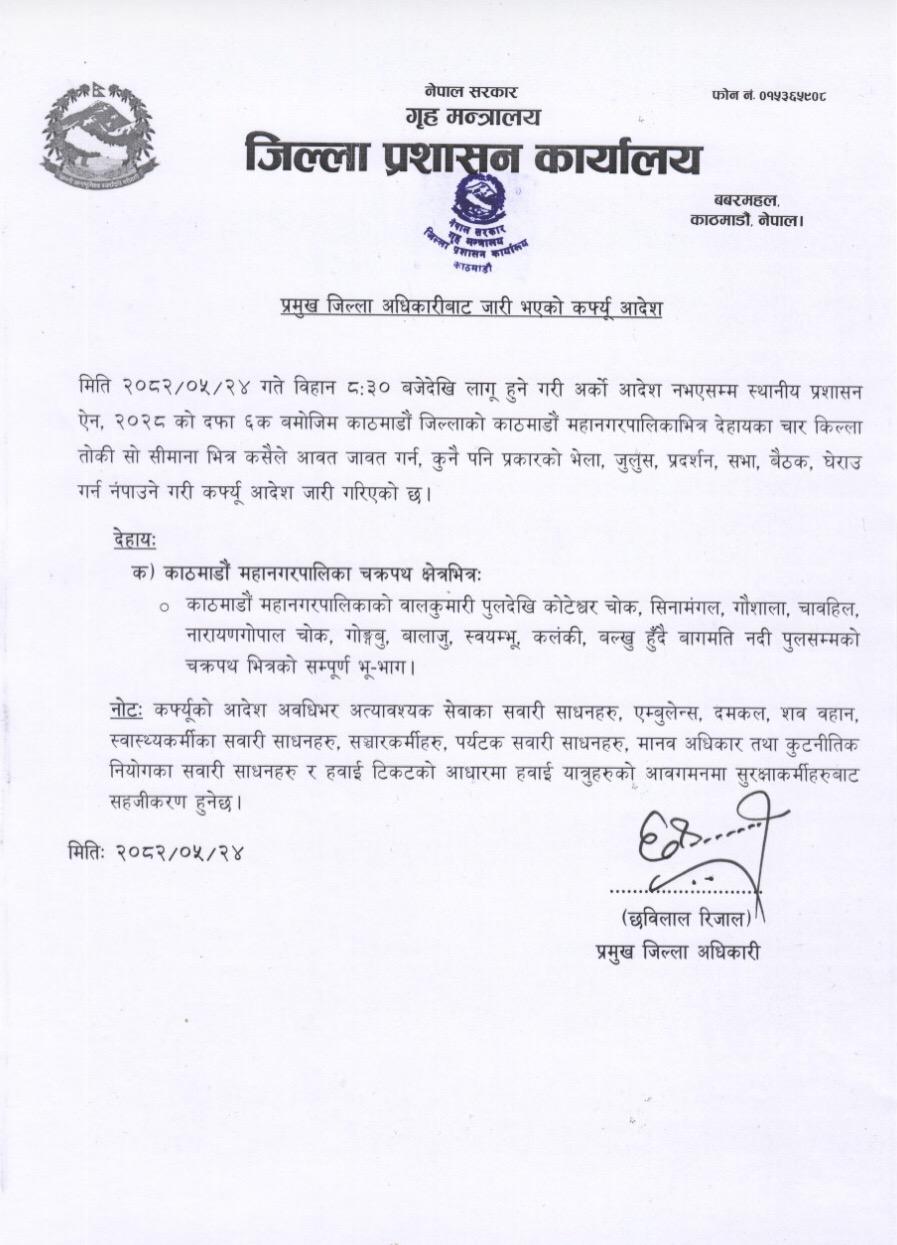 प्रजिअ रिजालले काठमाडौं महानगरपालिकाको बालकुमारी पुलदेखि कोटेश्वर चोक, सिनामंल, गौशाला, चाबहिल, नारायणगोपाल चोक, गोंगबु, बालाजु, स्वयम्भु, कलंकी, बल्खु हुँदै बागमती नदी पुलसम्मको चक्रपथभित्रको सम्पूर्ण भूभागमा कर्फ्यु लगाइएको बताउनु भएको छ । कर्फ्यु अवधिभर अत्यावश्यक सेवाका सवारी साधनहरुबाहेक अन्यलाई आउजाउ गर्न, सभा जुलुस गर्न वा कुनै पनि प्रकारको प्रदर्शन गर्न रोक लगाइएको बताइएको छ । सामाजिक सञ्जालमाथिको प्रतिबन्ध र भ्रष्टाचारविरुद्ध युवाहरुले हिजो काठमाडौं प्रदर्शन गर्दा प्रहरीको गोली लागेर १९ जनाको ज्यान गएको थियो ।