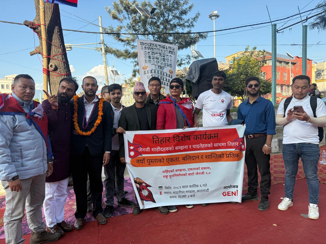 काठमाडौं, कार्तिक ६। GenZ 2.0 (सबै पुस्ताको सारथी) राष्ट्रिय अभियानले तिहारको अवसरमा “जेनजि सहिदहरूको सम्झनामा” शीर्षकमा विशेष श्रद्धाञ्जली कार्यक्रम काठमाडौंको माईतीघर मण्डलामा सम्पन्न गरेको छ। कार्यक्रमको मुख्य उद्देश्य सहिदहरूको बलिदानलाई सम्मान गर्दै राष्ट्रिय एकताको सन्देश फैलाउने र सहिदहरूको सपना पूरा गर्ने प्रतिबद्धता जनाउनु रहेको थियो। कार्यक्रममा GenZ 2.0 का प्रवक्ता अरविन राई, सदस्य–सचिव कुन्दन कुशवाहा, र कोर कमिटी सदस्यहरू विपिन दुलाल, हेम खड्का, गौरव देवकोटा लगायतका वक्ताहरूले सहिदहरूको आदर्श र बलिदानलाई राष्ट्रनिर्माण र आत्मनिर्भर अर्थतन्त्रसँग जोड्नुपर्नेमा जोड दिएका थिए।  अरविन राईले भने, “सहिदहरूले चाहेको नेपाल — एकताबद्ध, आत्मनिर्भर र न्यायपूर्ण — बनाउनु नै हाम्रो पुस्ताको जिम्मेवारी हो।”  कुन्दन कुशवाहाले जोड दिए, “यो कार्यक्रम केवल सम्झना होइन, सहिदहरूको सपना साकार पार्ने राष्ट्रिय एकताको अभियान हो।”