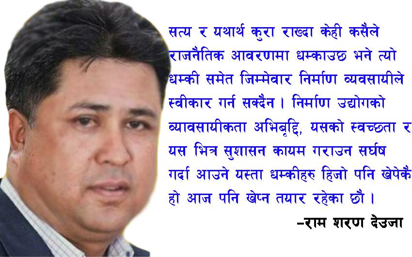 त्यो पनि छानबिन गरेर आएको फिल्डिङकोे आधारमा सुबिस्ताको र कारबाहीको प्रक्रिया अपनाएर तोडनु पर्छ । यसरी सत्य र यथार्थ कुरा राख्दा केही कसैले राजनैतिक आवरणमा धम्काउछन भने त्यो धम्की समेत जिम्मेवार निर्माण व्यवसायीहरुले स्वीकार गर्न सक्दैन । निर्माण उद्योगको व्यावसायीकता अभिबृद्दि, यसको स्वच्छता र यस भित्र सुशासन कायम गराउन सर्घष गर्दा आउने यस्ता धम्कीहरु हिजो पनि खेपेकै हो आज पनि खेप्न तयार रहेका छौ ।
