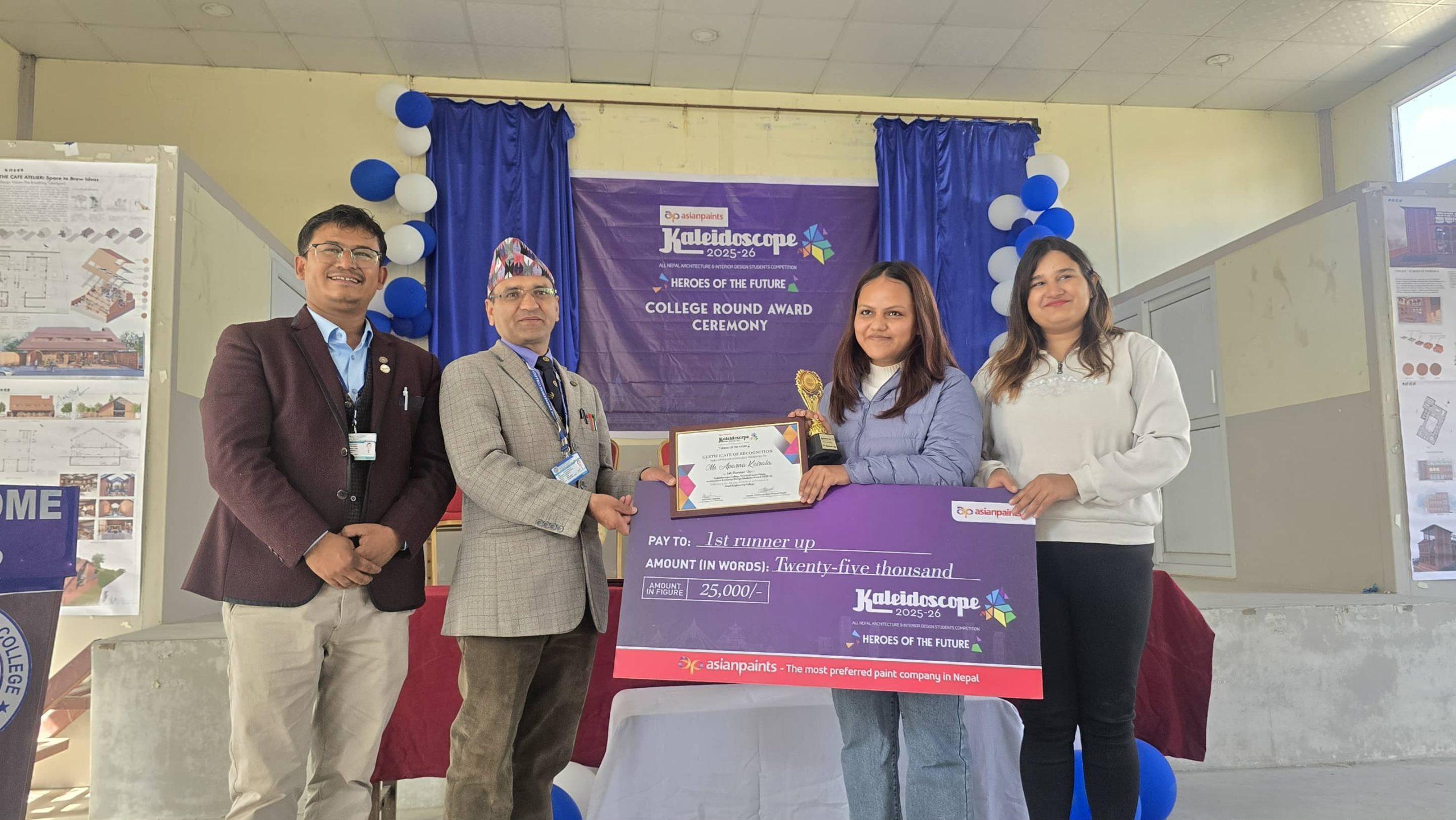 काठमाडौं । अन्तर कलेज एसियन पेन्ट्स डिजाइन प्रतियोगिता २०२५ (एपीडीसी अवार्ड) मा उत्कृष्ट भएका विद्यार्थीहरु विहीबार पुरुस्कार वितरण गरिएको छ । नेपाल इन्जिनियरिंग कलेज दुवाकोट चाँंगुनारायण भक्तपुरमा उनीहरुलाई नगद सहित पुरस्कार तथा प्रमाणपत्रबाट सम्मान समेत गरिएको बताइएको छ ।