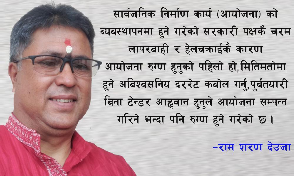 सार्वजनिक निर्माण कार्य (आयोजना) को व्यवस्थापनमा हुने गरेको सरकारी पक्षकै चरम लापरबाही र हेलचक्राईकै कारण आयोजना रुग्ण हुनुको पहिलो हो भने त्यसमध्य पनि मितिमतोमा हुने अबिश्वसनिय दररेट कबोल गर्नु नै र पुर्वतयारी बिना टेन्डर आह्वान हुनुले आयोजना सम्पन्न गरिने भन्दा पनि रुग्ण हुने गरेको छ ।