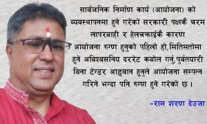 राम शरण देउजा देशको कुनै पनि विकास निर्माणकालागि सरकारले नै विशेष योजना बनाउनु पर्ने हुन्छ । सरकारले बताएको कार्य निर्देशिका, नीति नियम र कानुनबाटै विकास निर्माण गर्ने मार्ग निर्देशन हुन्छ । तर देशमा रहेको कानुन र नीति नियमका कार्यान्वयनमा सरकारी पक्षबाट नै कमजोरी र लापरबाही गर्ने गरेका कारण अधिकाशं आयोजनाहरु रुग्ण बन्ने गरेको पछिल्ला केही … Continue reading सरकारी व्यबस्थापनमा हुने चरम लापरबाहीकै कारण आयोजना रुग्ण