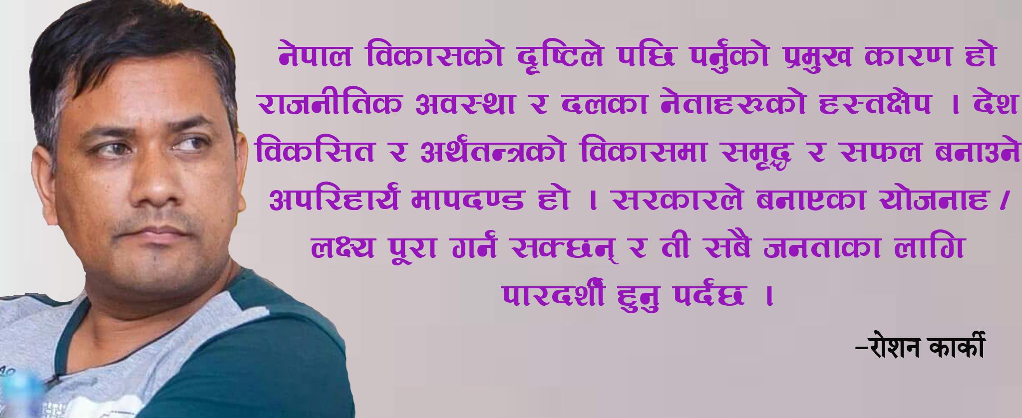 सरकारले बनाएका योजनाहरू लक्ष्य पूरा गर्न सक्छन् र ती सबै जनताका लागि पारदर्शी हुनु पर्दछ । तर, नेपालमा बनाइएका योजनाले आफ्नो लक्ष्य हासिल गर्न सकि रहेको छैन । जहाँ राजनीतिक एकताको अभाव, पक्षपात, नातावाद, घुसखोरी र भ्रष्टाचारका कारण राष्ट्र आर्थिक रुपमा असफल हुदै गएको छ । भने नेपाल भ्रष्ट र अकुशल सरकारद्वारा सञ्चालित देशका रुपमा विश्वले चिन्ने गरेको छ । त्यसलाई हटाउन सम्बन्धित निकाय नलाग्दा देश अस्थिरता र अनिश्चितताको भुमरीमा फस्दै गएको छ ।