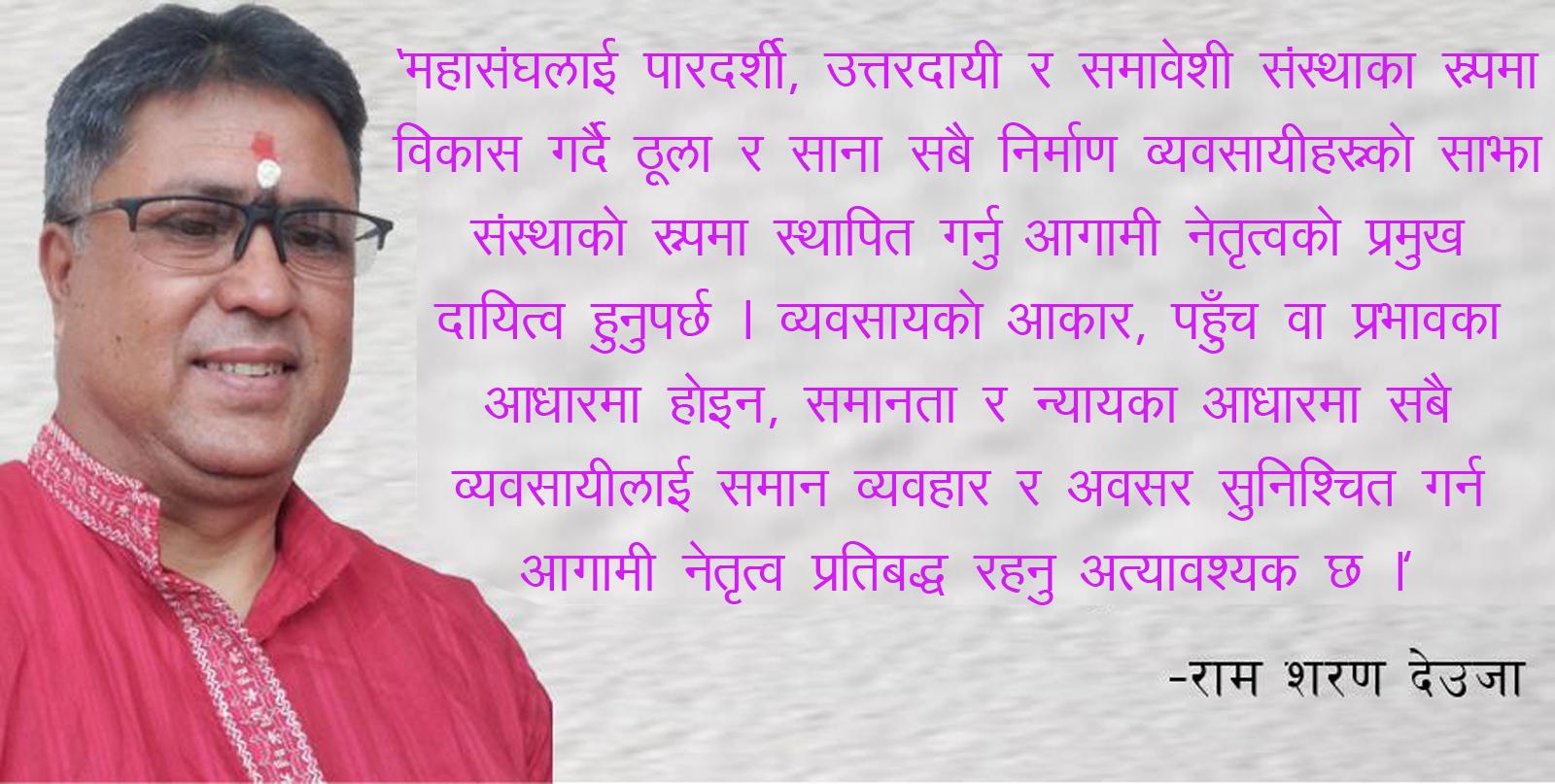 राम शरण देउजा नेपाल निर्माण व्यवसायी महासंघ मुलुकको पूर्वाधार विकासमा महत्वपूर्ण भूमिका निर्वाह गर्ने अनि विकास र समृद्धिका सम्बाहक निर्माण व्यवसायीहरुको छाता संस्था समेत हो । यस महासंघको आगामी नेतृत्वले निर्माण व्यवसायीहरूको साझा आवाजलाई अझ सशक्त, विश्वसनीय र परिणाममुखी रूपमा अघि बढाउने अपेक्षा म लगायत सम्पूर्ण निर्माण व्यवसायीहरुले गरेका छन् र गर्नु पनि पर्दछ । … Continue reading महासंघलाई पारदर्शी,उत्तरदायी र समावेशी संस्थाको रुपमा विकास गर्ने नेतृत्वको अवश्यकता छ !!!