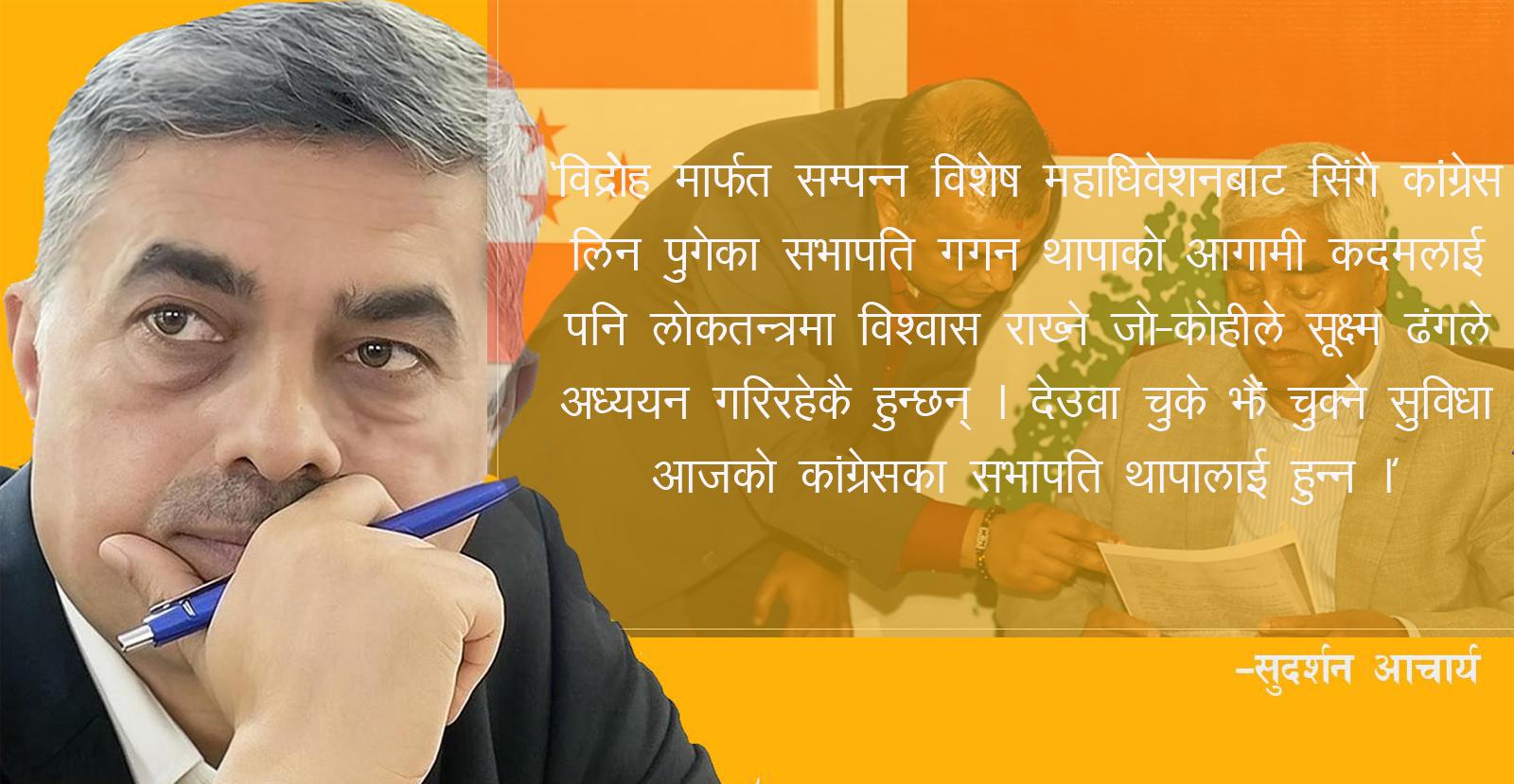 यो सबै भाष्यलाई चिरेर स्वच्छ कांग्रेसजनलाई समेटेर ‘प्रष्ट’ कांग्रेस निर्माण अभियान थालिहाल्दा नै विशेष महाधिवेशनले ‘देउवा’ नेतृत्वको कांग्रेस केन्द्रीय समिति विघटन गरी ‘थापा’ नेतृत्वको कांग्रेस केन्द्रीय समिति निर्माणको औचित्य पुष्टि हुनसक्दछ । अन्यथा, भावी चुनौतीलाई आजका कांग्रेस सभापति तथा युवा नेता गगन थापाले पनि सामना गर्न सकेनन् भने त्यसपछि उत्पन्न हुने निराशाले लोकतन्त्रवादीहरूको मनोबल त गिर्छ नै, त्यतिबेला कांग्रेस पार्टी कमजोर हुँदा संघीय लोकतान्त्रिक गणतन्त्र पनि सँगसँगै कमजोर हुँदै जानेछ ।