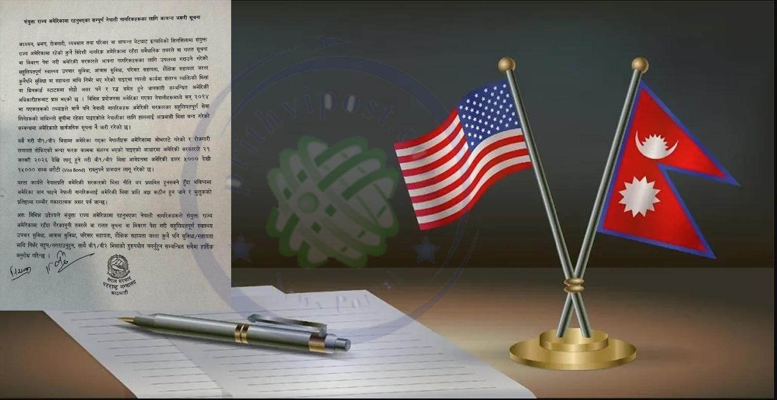 विभिन्न उद्देश्यले अमेरिकामा रहनुभएका नेपाली नागरिकहरूले गैरकानूनी तवरले सहुलियतपूर्ण सुविधामा निर्भर नहुन र बी१रबी२ भिसाको दुरुपयोग नगर्न हार्दिक अनुरोध गरिन्छ दूतावासको सूचनामा उल्लेख छ। पछिल्लो समय अमेरिकाले आप्रवासी सम्बन्धी नियमहरूमा गरिरहेको फेरबदलले त्यहाँ रहेका र जान चाहने नेपालीहरूका लागि कानुनी चुनौतीहरू थपिने संकेत देखिएको छ।