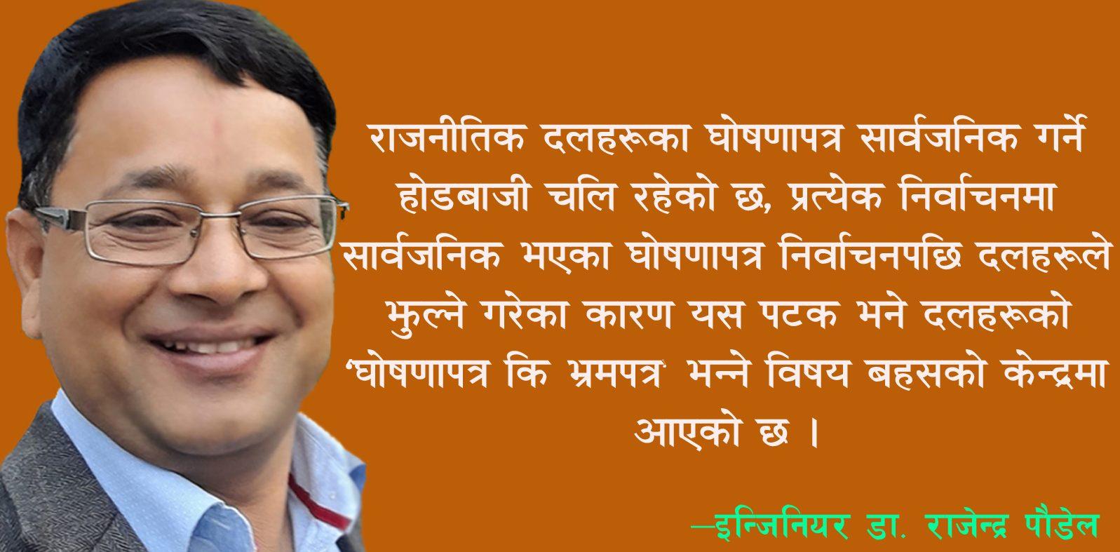 निर्वाचन नजिकिँदै जाँदा राजनीतिक दलहरूका घोषणापत्र सार्वजनिक गर्ने होडबाजी चलि रहेको छ । प्रत्येक निर्वाचनमा सार्वजनिक भएका घोषणापत्र निर्वाचनपछि दलहरुले झुल्ने गरेका कारण यस पटक भने दलहरुको घोषणापत्र कि भ्रमपत्र भन्ने विषय बहसको केन्द्रमा आएको छ ।