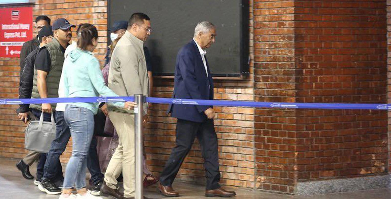 देउवा बुधबार राति साढे १० बजे अन्तर्राष्ट्रिय टर्मिनल तर्फको स्टेरलाइज एरिया (विमान प्रतीक्षा कक्ष) मा देखिनुभएको थियो,’ स्रोतले भन्यो, ‘अरु २–३ जना पनि साथमै देखिन्थे ।’ यसअघि नेपाली कांग्रेसका ‘अपदस्त सभापति’ तथा ५ पटकका प्रधानमन्त्री देउवाले फागुन २१ गतेको प्रतिनिधि सभा निर्वाचनमा मतदान समेत नगर्ने समाचार सार्वजनिक भएको थियो ।
