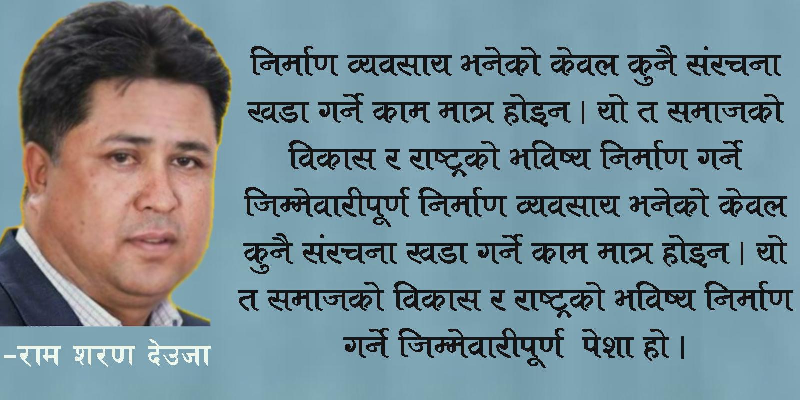 समाजले निर्माण व्यवसायीलाई केवल इँटा र सिमेन्ट जोड्ने कालिगढको रूपमा मात्र बुझ्नु ठूलो भुल हो भने निर्माण व्यवसायीहरूले पनि आफ्नो पेशालाई केवल पैसा कमाउने मेसिन मात्र ठान्नु अझ ठूलो भुल हो।